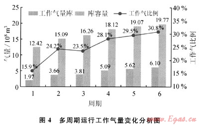 工作氣能力快速提高,工作氣比例總體增加,其變化示意圖見圖4。經(jīng)過6個(gè)周期后,工作氣量由1.97×108m3增至6.10×108m3,增加2.1倍。工作氣比例由15.9%增至30.8%,增幅為90%。