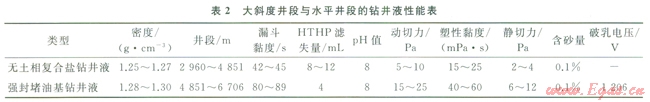 該井Æ215.9mm井段采用無土相復(fù)合鹽鉆井液體系,通過加入無機(jī)鹽和有機(jī)鹽提高體系抑制性[9]。在井斜角30°、45°、60°時(shí)需調(diào)整控制鉆井液的密度;通過增加陽離子乳化瀝青粉和細(xì)目碳酸鈣的含量,提高封堵性來降低地層的坍塌壓力;嚴(yán)格控制鉆井液的濾失量,要求APl濾失量控制在2mL以內(nèi),該體系抑制性強(qiáng)、固相含量比較低(表2),性能穩(wěn)定,有效提高機(jī)械鉆速[10]。