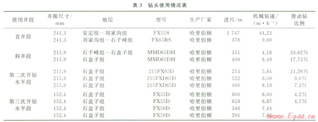 該井第二次開鉆的Æ241.3mm+Æ215.9mm井眼全部采用PDC鉆頭,直井段穿越多個(gè)層位,劉家溝組以上地層平均巖石可鉆性為3級,且波動(dòng)范圍較小,相對均質(zhì);劉家溝組以下井段鉆遇地層富含礫砂巖、含礫中粗粒石英砂巖,平均研磨性指數(shù)為6[11]。地層軟硬交錯(cuò)比較嚴(yán)重,巖石可鉆性及抗壓強(qiáng)度波動(dòng)范圍較大。根據(jù)地層巖性,優(yōu)選不同的鉆頭型號,有效地提高了鉆井速度(表3)。