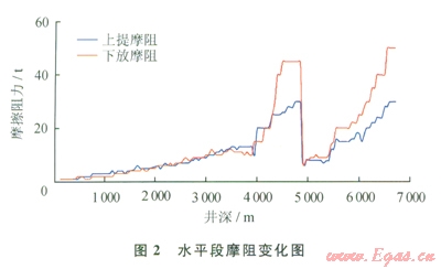 在長水平段水平井鉆井過程中,由于鉆具與井壁底部形成的巖屑床相互作用,鉆井液固相含量高導(dǎo)致潤滑效果下降等[4]原因,鉆具與井壁之間的摩擦阻力隨著水平段長度的增加而不斷增大,影響水平段鉆進(jìn)長度。根據(jù)常規(guī)水平井實(shí)鉆分析,裸眼內(nèi)摩擦系數(shù)比套管內(nèi)摩擦系數(shù)大。Æ215.9mm井眼的水平段鉆至4851m,鉆水平段長度1200m,下Æ177.8mm套管固井。根據(jù)現(xiàn)場施工獲得的扭矩、摩阻數(shù)據(jù)分析(圖2、3),通過優(yōu)化井身結(jié)構(gòu),有效降低了長水平段施工過程中的摩阻系數(shù),提高了施工效率。