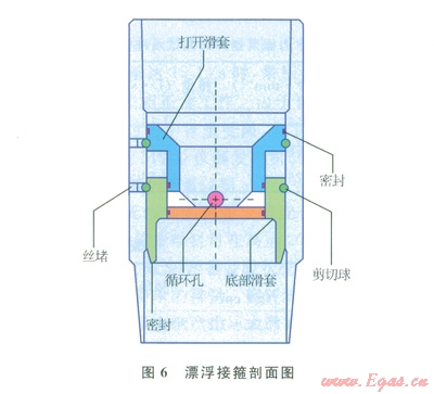為了順利將Æl77.8mm套管下入長1200m的Æ215.9mm井眼內(nèi),在套管串中應(yīng)用了漂浮接箍(圖6)。漂浮接箍上部的套管柱灌入鉆井液,下部的套管內(nèi)部充滿空氣(沒有鉆井液),漂浮接箍下部套管入井后受到鉆井液的浮力作用降低了井壁對套管柱的摩擦阻力;而漂浮接箍上部的套管內(nèi)灌有鉆井液會(huì)增加套管柱的重量,確保套管順利入井。下到預(yù)定深度后向套管內(nèi)加壓,直到扣‘開滑套向下移動(dòng)讓鉆井液與空氣進(jìn)行交換。當(dāng)流動(dòng)穩(wěn)定后,整個(gè)套管柱內(nèi)都充滿了鉆井液投入下膠塞,注入水泥漿,浮鞋盲板打開。當(dāng)下膠塞坐定在滑套上后,剪斷銷釘,水泥漿就把下膠塞和漂浮接箍的兩個(gè)滑套一起下推向下部的浮箍下膠塞和兩個(gè)滑套坐定在浮箍上,并與浮箍密封。下膠塞破裂,水泥漿通過浮鞋泵出,頂替上膠塞,并與浮箍處的下膠塞和漂浮接箍組件形成密封,確保固井質(zhì)量。