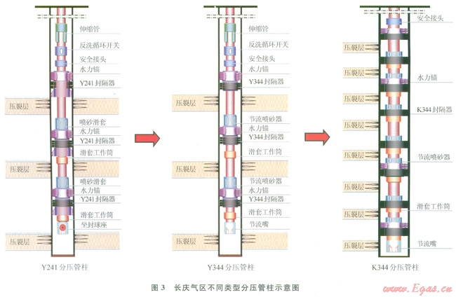 通過(guò)優(yōu)化井身剖面和“四合一”鉆具組合[12],實(shí)現(xiàn)小位移井“1~2趟鉆”,大位移(超過(guò)850m)井“2~3趟鉆”,提高了鉆井效率。平均鉆井周期21.7d,最短鉆井周期l3d;平均水平位移914.5m,最大位移達(dá)到1400m。建立“設(shè)計(jì)四防碰,施工三預(yù)防,空間三繞障”防碰繞障理論體系,采用軌跡空間球面掃描方法,模擬井身軌跡空間展布與安全井間距曲線(xiàn)。分層改造取得重要進(jìn)展,通過(guò)分壓管柱優(yōu)化,由早期Y241分壓管柱優(yōu)化為目前的K344分壓管柱(圖3),實(shí)現(xiàn)了一次連續(xù)分壓8層的新突破。2012年機(jī)械封隔分壓5層以上現(xiàn)場(chǎng)試驗(yàn)39口井,平均試氣產(chǎn)量10.93×104m3/d。