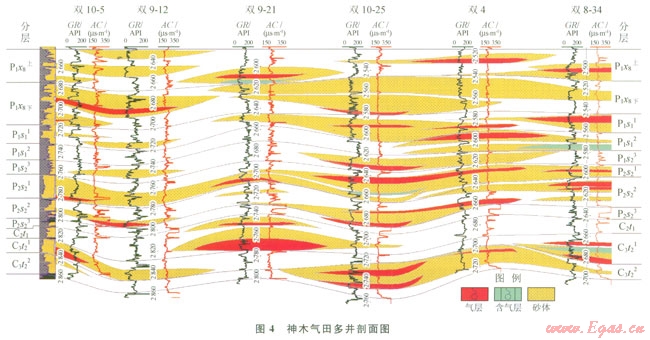 神木氣田具有多層系含氣特征(圖4),并且和煤田高度重疊,開(kāi)發(fā)難度較大,叢式井鉆完井技術(shù)進(jìn)步顯著提高了神木氣田開(kāi)發(fā)水平。2012年神木氣田完鉆124口井,其中5口井以上的叢式井組14個(gè)85口井,最大叢式井組轄井11口,完試46口,平均無(wú)阻流量12.35×104m3/d。