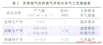 加強(qiáng)排水采氣成熟技術(shù)的規(guī)?;瘧?yīng)用,形成了不同類(lèi)型氣井排水采氣技術(shù)對(duì)策(表2);積極開(kāi)展數(shù)字化關(guān)鍵設(shè)備與控制軟件的研發(fā),低產(chǎn)低效井排水采氣技術(shù)應(yīng)用成效顯著。2012年開(kāi)展各類(lèi)排水采氣2330口井/4.36萬(wàn)井次,累計(jì)增產(chǎn)氣量4.86×108m3。