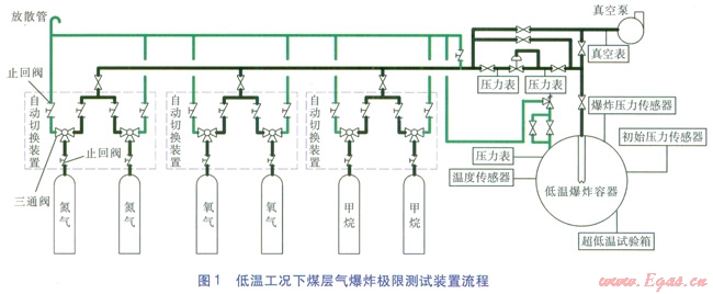 低溫工況下煤層氣爆炸極限的測試裝置流程按功能分為吹掃流程及引爆試驗(yàn)流程。吹掃流程:在進(jìn)行試驗(yàn)之前必須對管道進(jìn)行吹掃,即打開氮?dú)鈿馄砍隹陂y門,用氮?dú)獯祾哒麄€回路,由放散管集中排放。引爆試驗(yàn)流程:關(guān)閉氮?dú)鈿馄砍隹陂y門,啟動真空泵將低溫爆炸容器抽至-0.02MPa;關(guān)閉真空泵,依次打開氮?dú)狻⒀鯕?、甲烷氣瓶,按比例充入到低溫爆炸容器?nèi);待各組分充分混合均勻后利用超低溫試驗(yàn)箱降溫,進(jìn)行引爆試驗(yàn)。低溫工況下煤層氣爆炸極限測試裝置流程見圖l。