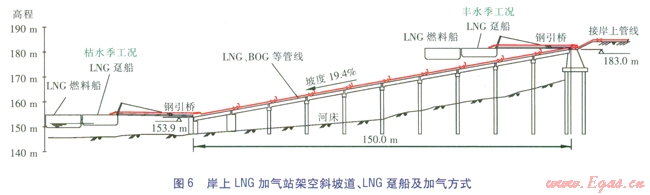 儲(chǔ)氣罐布置于岸上,安全可靠性強(qiáng);有現(xiàn)行國家規(guī)范作為設(shè)計(jì)、施工依據(jù);岸上LNG卸氣與船上LNG加氣可同時(shí)進(jìn)行,LNG加氣時(shí)間不受影響,充分滿足加氣船舶的需求;岸上LNG儲(chǔ)存設(shè)施可預(yù)留位置,加氣規(guī)模有發(fā)展余地;架空斜坡道長度短,施工工期略短,對(duì)通航行洪影響??;造價(jià)較低。