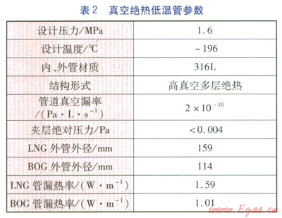 架空斜坡道上的LNG輸送管道內(nèi)管為公稱直徑80mm的真空絕熱低溫管道,BOG管道內(nèi)管為公稱直徑50mm的真空絕熱低溫管道。真空絕熱低溫管參數(shù)見表2。