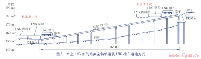 水上LNG加氣站架空斜坡道及LNG槽車運(yùn)輸方式見圖3。