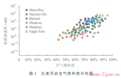 美國是頁巖氣開發(fā)利用最成功的國家,全美頁巖氣技術(shù)可采資源量為24.4×1012m3,投入商業(yè)開發(fā)的主要為海相頁巖,有Barnett、Marcellus、Antrim、Fayetteville、Woodford和Haynesville頁巖等[5]。2005年以來,隨著以水平井分段壓裂為代表的關(guān)鍵技術(shù)的突破,促進(jìn)了美國頁巖氣產(chǎn)業(yè)的快速發(fā)展。據(jù)美國能源信息署預(yù)測,2015年美國頁巖氣產(chǎn)量將達(dá)到2600×108~2800×108m3,約占天然氣總產(chǎn)量的l/3[6-7]。北美地區(qū)凡是商業(yè)化的頁巖,其含水飽和度都很低,平均為l5%~35%[8-9],反之則含氣飽和度較高(圖1)。