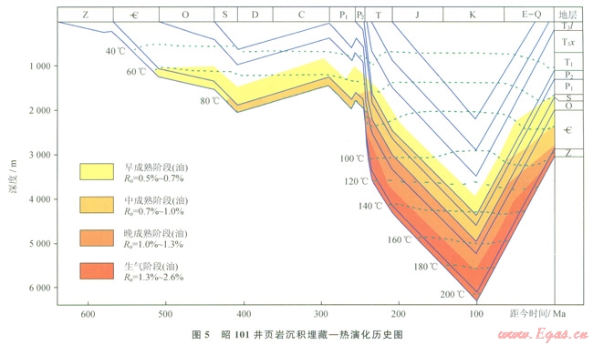 筆者以昭101井、l03等井為例開展了歷史模擬和流體包裹體分析,證實(shí)了斷裂對(duì)氣藏起強(qiáng)烈破壞這一判斷。昭通除靠近四川盆地的小部分區(qū)域外,多數(shù)鉆井都不成功,含氣量低(0.05~0.50m3/t)。昭通與蜀南相鄰,應(yīng)該大致經(jīng)歷了相似的演化歷程(圖5),含氣性差別大。昭101井位于芒部背斜,地表斷裂發(fā)育。目的層筇竹寺組因斷裂出現(xiàn)地層重復(fù),頁巖裂隙發(fā)育、方解石充填嚴(yán)重,含氣量的現(xiàn)場分析結(jié)果不足0.1m3/t,評(píng)價(jià)為極低含氣量,基本全部逸散。開展的昭101井熱演化歷史和含氣量歷史模擬研究表明:昭通地區(qū)J-K末期含氣量最大,如果穩(wěn)定抬升頁巖將出現(xiàn)超壓,含氣量應(yīng)該至少介于3~5m3/t,但是目前小于0.1m3/t(圖6)。