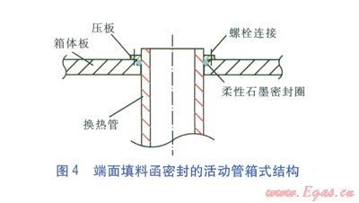 為降低成本,經(jīng)過分析研究,決定選用抗腐蝕性能高且價格低的復合管材——20號鋼管外表面鍍搪瓷,采用端面填料函密封的活動管箱式結構(見圖4)。