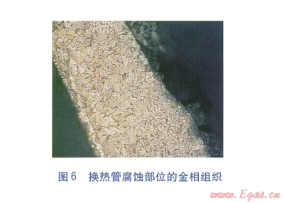 鍍搪瓷鋼管穿入箱體板中,壓板擠壓柔性石墨密封圈,以填充箱體板與換熱管間的填料函起到密封作用。與整體焊接的固定管箱式結構相比,這種結構一是可以削弱換熱管根部承受的交變應力,二是可有效避免焊接導致的管道抗腐蝕性能的降低。經(jīng)過技術改造,使用壽命提高到l0~12個月。雖然技術改造后空氣預熱器的使用壽命有了一定延長,但效果仍不理想。通過現(xiàn)場勘察,技術改造基本杜絕了換熱管主體的酸露點腐蝕,腐蝕主要發(fā)生在換熱管與箱體板、柔性石墨密封圈接觸的部位(見圖5)。通過對換熱管腐蝕部位的金相組織(見圖6)分析發(fā)現(xiàn),腐蝕成因為典型的縫隙腐蝕[3-4]。