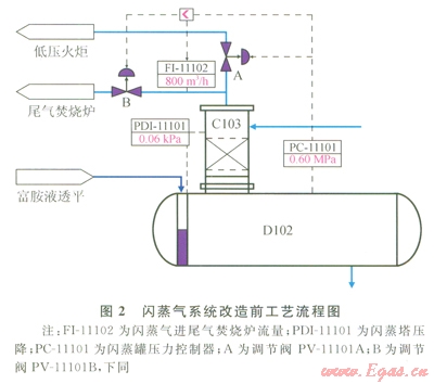 工藝改造前,來自液力透平的富胺液進入閃蒸罐,在罐內(nèi)閃蒸出所攜帶的輕烴,閃蒸氣經(jīng)閃蒸氣吸收塔吸收所含H2S后分為兩路,一路到低壓火炬放空,另一路直接入尾氣焚燒爐F-403伴燒,其工藝流程如圖2所示。