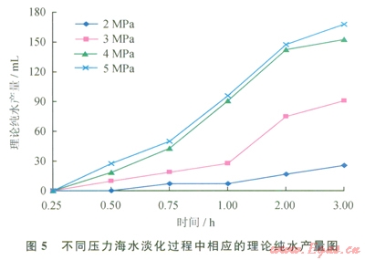 反應(yīng)壓力與理論純水產(chǎn)量的關(guān)系見圖5。由圖5可看出,理論純水產(chǎn)量隨著壓力的升高而不同程度地升高。4MPa環(huán)境壓力的純水產(chǎn)量較2MPa、3MPa有明顯升高,雖然5MPa的純水產(chǎn)量為最高,但是效果與4MPa環(huán)境壓力相差不大。從實(shí)驗(yàn)中可知,環(huán)境壓力4MPa左右可獲得較高的海水淡化效率,同時(shí)成本也不會(huì)太高。考慮到海水深度可提供1MPa左右的環(huán)境壓力。因此,可選定CO2氣體的初始?jí)毫?span lang="EN-US">3~4MPa.