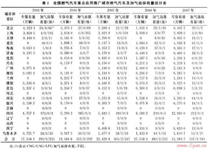 我國在“十五”、“十一五”期間投入巨大的人力和財力支持節(jié)能與新能源汽車重大項目。“十五”期間,我國有19個城市(地區(qū))開展了燃?xì)馄囀痉锻茝V應(yīng)用,目前已達(dá)到22個。截至2007年燃?xì)馄嚤S辛窟_(dá)31.3837萬余輛,加氣站702座,詳見表1。其中,四川省作為首批燃?xì)馄噾?yīng)用推廣示范地區(qū),其燃?xì)馄嚨募夹g(shù)研究和應(yīng)用推廣始終走在全國前列。乙醇汽油在吉林省全面推廣應(yīng)用,甲醇汽油在山西、陜西部分城市、四川瀘州等城市試點取得階段性經(jīng)驗成果;LNG公交車在長沙、貴陽試點取得階段性經(jīng)驗成果。