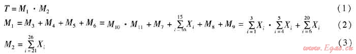 將調(diào)壓站的火災爆炸事故作為事故樹頂事件,將天然氣泄漏、存在點火源作為次頂事件。采用此方法逐步深入細化,直至列出底事件。天然氣調(diào)壓站火災爆炸事故樹見圖1,其中T表示頂事件;Mi(i=1~11)表示中間事件;Xi(i=1~26)表示底事件;·表示邏輯與門;+表示邏輯或門。