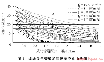 根據(jù)計算結(jié)果[3]繪制出埋地采氣管道沿程溫度變化曲線(如圖1所示)。