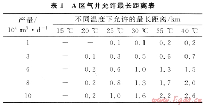 1) A區(qū)氣井的天然氣不伴熱直接進站,不加熱直接脫水,可以取消采氣管道伴熱和站內(nèi)加熱工藝。不同產(chǎn)氣量和井口溫度允許采氣管道距離不同,其允許最長距離見表1。