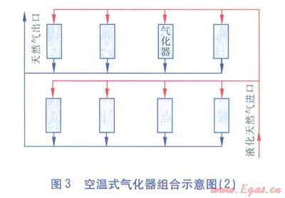 空溫式氣化器的臺數(shù)和氣化量,可跟據(jù)工程建設規(guī)模和用戶的要求綜合確定??諟厥綒饣鹘M合示意見圖2、3。