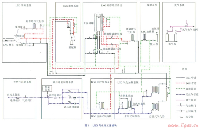 LNG氣化加熱系統(tǒng)主要由空溫式氣化器、水浴式加熱器、低溫截止閥和緊急切斷閥、氣相和液相管道、安全放散管等組成。