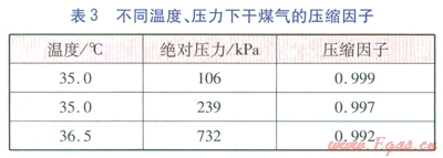 理想氣體的壓縮因子值等于l,實(shí)際氣體壓縮因子值趨于1時(shí),性質(zhì)趨于理想氣體[1]。表3是某公司人工煤氣的壓縮因子值[1],我公司人工煤氣的組成與該公司人工煤氣組成差別不大,可參考表3,其壓縮因子值與理想氣體壓縮因子偏差小于1%。因此,在732kPa以下,干煤氣可看成是理想氣體。