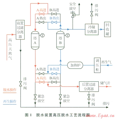 脫水操作流程:被壓縮后的高壓天然氣經(jīng)前置過(guò)濾分離器分離可能存在的游離水、油和雜質(zhì),然后經(jīng)A高進(jìn)閥從塔A頂部進(jìn)入,與塔內(nèi)分子篩充分接觸,分子篩吸附高壓天然氣所含的水和部分烴得到干燥的天然氣,干燥后的天然氣從塔A底部排出,經(jīng)A高出閥進(jìn)入后置過(guò)濾分離器分離后進(jìn)入高壓儲(chǔ)氣容器。后置過(guò)濾分離器主要濾掉氣流中攜帶的分子篩粉末,以免堵塞后續(xù)設(shè)備。
