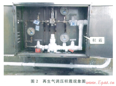 由脫水裝置工藝流程知,再生氣從塔A頂部排出時(shí)攜帶了大量的熱量直接進(jìn)入冷凝分離器,存在如下問(wèn)題:①冷凝分離器進(jìn)口溫度較高,不利于氣液分離,影響分離效果;②再生氣的熱量大量浪費(fèi),沒(méi)能得到再次利用,同時(shí)也提高了回收罐的溫度。再生氣調(diào)壓后存在節(jié)流降壓積霜現(xiàn)象(圖2),導(dǎo)致加熱爐的進(jìn)氣溫度很低,而脫水塔頂部出口溫度較高,致使冷凝分離器進(jìn)口溫度較高,不利于CNG分離,由此提出了再生氣余熱利用節(jié)能技術(shù),即利用再生氣的余熱預(yù)熱調(diào)壓后的低溫再生氣,同時(shí)利用調(diào)壓閥節(jié)流降溫后的冷量冷卻脫水后的高溫再生氣,兩者的能量(熱量與冷量)互補(bǔ)利用,實(shí)現(xiàn)節(jié)能降耗的目的。節(jié)能技術(shù)有如下效果:①提高再生氣進(jìn)入加熱爐的進(jìn)氣溫度,降低加熱爐的電耗;②減少再生氣加熱時(shí)間,減少再生氣的用量;③降低冷凝分離器進(jìn)口溫度,提高分離效果。