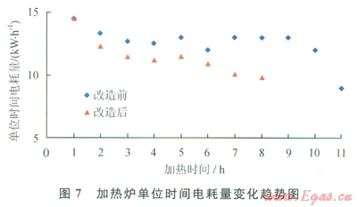 分析上述圖表數(shù)據(jù)可以得出:①改造后加熱時(shí)間減少了27.3%,再生氣用量減少了18.4%,加熱爐電耗量減少了28.6%;②由于再生氣余熱是一個(gè)自身循環(huán)預(yù)熱的過(guò)程,大約lh之后,換熱爐才開(kāi)始對(duì)再生氣預(yù)熱,隨后加熱爐進(jìn)口溫度緩慢升高,最后管壁溫度穩(wěn)定在47℃左右;③再生氣余熱利用存在滯后,隨著換熱器逐漸換熱,加熱爐單位時(shí)間電耗量相比改造前電耗減小,充分說(shuō)明再生氣余熱得到利用,達(dá)到了節(jié)能運(yùn)行的目的。