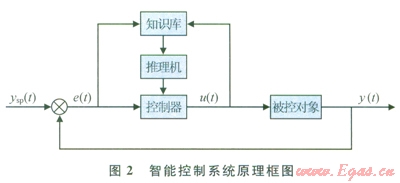 智能控制系統(tǒng)由知識庫、推理機(jī)及控制器組成,基本模型見圖2。圖2中u(t)為控制量,e(t)為偏差,ysp(t)為設(shè)定值,y(t)被控參數(shù)如流量、壓力、溫度等??刂屏?span lang="EN-US">u(t)與多種變量或事實(shí)相關(guān),構(gòu)成復(fù)雜的函數(shù)關(guān)系或變化規(guī)則。