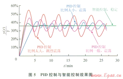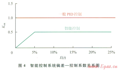 可見,采用智能控制,可使偏差快速穩(wěn)定收斂,當(dāng)[å|e(t)|/n]/Yset≥5%時(shí),采用固定比例控制,當(dāng)[å|e(t)|/n]/Yset≤5%時(shí),采用一定時(shí)間(大約0.5個波動周期)相對偏差絕對值的均值(10/Yset)[ å|e(t)|/n]作為改變控制量的隨機(jī)變動系數(shù),智能系數(shù)Kint,與E(t)在5%以下時(shí)呈線性遞增關(guān)系,控制量u(t)與E(t)呈非線性遞增關(guān)系。