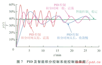 引用智能積分控制系數(shù),隨機(jī)改變積分強(qiáng)度,偏差越大、積分作用越強(qiáng),偏差越小、積分作用越弱。效果見圖6、7,圖中縱坐標(biāo)y(t)/Y表示被控參數(shù)與量程的百分比。