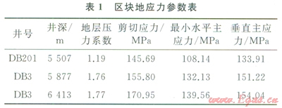 對大北區(qū)塊3口井的目的層實際取心進(jìn)行觀察,并利用FMI成像測井資料對取心井的目的層天然裂縫發(fā)育情況進(jìn)行了統(tǒng)計分析,結(jié)合鉆井地漏試驗,對區(qū)塊地應(yīng)力進(jìn)行研究及分析結(jié)果見表1。并求得壓裂層段的楊氏模量為32000~35000MPa,泊松比為0.22~0.24,水平應(yīng)力差為20~30MPa。