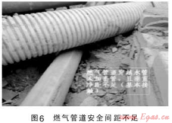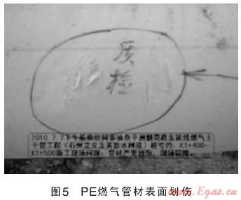 在燃?xì)夤艿朗┕み^(guò)程中,因施工單位人員、現(xiàn)場(chǎng)監(jiān)理人員以及建設(shè)單位現(xiàn)場(chǎng)管理人員對(duì)燃?xì)夤艿腊惭b施工質(zhì)量監(jiān)管不到位,施工經(jīng)驗(yàn)不足或者根本不懂燃?xì)夤艿朗┕さ闹匾?,不按照燃?xì)庑袠I(yè)國(guó)家規(guī)范和行業(yè)標(biāo)準(zhǔn)嚴(yán)格操作和監(jiān)管,產(chǎn)生一系列施工質(zhì)量隱患。如鋼管防腐處理不到位、閥井內(nèi)波紋補(bǔ)償器受外力安裝偏斜或不同軸,電熔管件焊接焊口冷卻采取沖水冷卻方式,PE管道運(yùn)輸、搬運(yùn)造成管壁劃傷嚴(yán)重超標(biāo)等人為因素,給城市燃?xì)夤艿腊踩\(yùn)行種下了一顆顆定時(shí)炸彈(如圖3、4、5)。