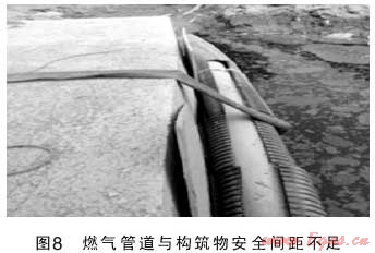 主要表現(xiàn)在:1)對(duì)壓力管道安全知識(shí)缺乏和對(duì)壓力管道有關(guān)介質(zhì)(如液化石油氣和天然氣)安全知識(shí)貧乏;2)對(duì)安全距離重視不足,壓力管道與其它設(shè)施距離不符合規(guī)范(GB50028-2006)相關(guān)要求,壓力管道與生活設(shè)施安全距離不足;3)無(wú)安全操作制度或有規(guī)定要求不嚴(yán)格執(zhí)行(如圖6、7、8)。