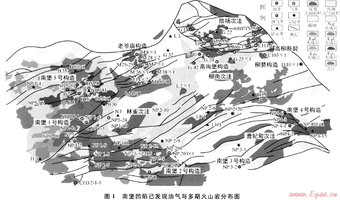 南堡凹陷現(xiàn)有油氣生產(chǎn)井約460口,主要分布于含油氣構(gòu)造單元內(nèi)中與油氣斷裂相關(guān)的構(gòu)造圈閉高點(diǎn)(圖1),多數(shù)井呈現(xiàn)油氣共生現(xiàn)象,并主要以油田伴生氣和凝析氣為主,純氣藏(干氣)所占比例較少,約占總井?dāng)?shù)的7.3%,其中高尚堡構(gòu)造、柳贊構(gòu)造、老爺廟構(gòu)造和南堡1號構(gòu)造主要為古近系-新近系砂巖油氣藏,天然氣性質(zhì)多為油田伴生氣和凝析氣,少見干氣,氣井?dāng)?shù)量多,但控制面積小,僅零散地分布在已探明的含油面積內(nèi);南堡5號構(gòu)造古近系砂巖及其火山碎屑巖儲集層中主要發(fā)育小規(guī)模凝析氣氣藏;南堡2號構(gòu)造奧陶系碳酸鹽巖儲集體中已探明一定規(guī)模的凝析氣藏。