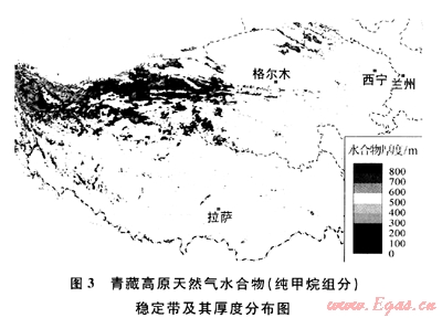 進(jìn)一步地,筆者分別利用祁連山木里地區(qū)33號(hào)鉆孔冷泉?dú)?CH4:96.6%,C2H6:3.3%,C3H8:0.1%,均為摩爾分?jǐn)?shù),下同)、風(fēng)火山-鳥麗地區(qū)頂空氣平均值(CH4:93.8%,C2H6:6.2%)和羌塘盆地雙湖地區(qū)頂空氣平均值(CH4:63.3%,C2H6:24.3%,C3H8:8.9%,nC4H103.5%)等實(shí)測(cè)氣體組分,結(jié)合青藏高原的其他參數(shù),對(duì)青藏高原天然氣水合物的穩(wěn)定帶及其厚度進(jìn)行了計(jì)算,結(jié)果顯示青藏高原具備較好的天然氣水合物形成條件,即使要求最為苛刻的純甲烷水合物也能在局部地區(qū)形成(圖3),且隨著重?zé)N組分的逐漸增加,能形成水合物的地區(qū)范圍逐漸增大,水合物穩(wěn)定帶厚度也逐漸增厚。