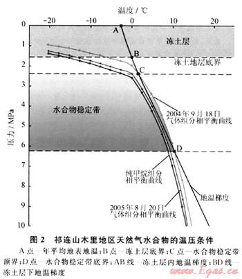 天然氣水合物形成于低溫高壓環(huán)境下,并需要有接近于飽和的氣源條件和充足的水源條件,同時(shí)氣體組成及其孔隙水鹽度也將影響到水合物能否形成并保持穩(wěn)定。由于中國(guó)凍土區(qū)的水源條件比較豐富,故制約水合物能否形成的關(guān)鍵因素是氣源條件和溫壓條件,這里先就溫壓條件進(jìn)行深入分析。