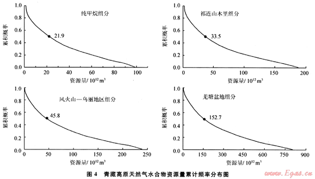 運(yùn)用體積法估算天然氣水合物資源量時(shí),由于上述5個(gè)參數(shù)特別是沉積物孔隙度(φ)和水合物飽和度(H)的取值范圍變化較大,從而影響了計(jì)算結(jié)果的可信度。因此,利用蒙特卡羅法對(duì)青藏高原的資源量再次進(jìn)行了估算。蒙特卡羅法是利用各種隨機(jī)變量的抽樣序列模擬給定概率的統(tǒng)計(jì)模型,得出數(shù)值解的近似統(tǒng)計(jì)值。體積法計(jì)算天然氣水合物資源量的5個(gè)參數(shù)中除分布面積(A)外,其他4個(gè)參數(shù)都是獨(dú)立的隨機(jī)變量,針對(duì)任一隨機(jī)變量蒙特卡羅法均可根據(jù)大量的實(shí)測(cè)數(shù)據(jù)(或理論假設(shè)數(shù)據(jù)),計(jì)算出相應(yīng)的頻率曲線,再根據(jù)頻率曲線給出一定頻率下的樣本值。然后根據(jù)一定概率下(例如0.5)各參數(shù)的樣本值計(jì)算出這一概率下的天然氣水合物資源量。蒙特卡羅法的估算結(jié)果顯示,在0.5概率下青藏高原純甲烷組分、祁連山木里組分、風(fēng)火山-烏麗地區(qū)組分和羌塘盆地組分天然氣水合物的資源量分別為21.9×1012m3、33.5×1012m3、45.8×1012m3和153×1012m3(圖4),均比體積法估算的相應(yīng)資源量要大。
