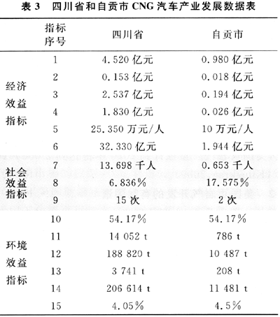 筆者根據(jù)本課題研究收集到的2007年自貢市和四川省數(shù)據(jù)為基礎(chǔ),以四川省為評價參照對象,對自貢市CNG汽車產(chǎn)業(yè)發(fā)展的綜合效益進(jìn)行評價。