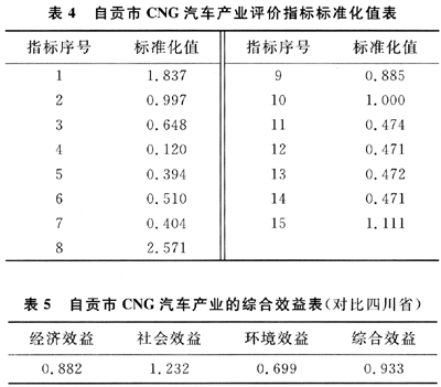 按上述評價模型,將2007年自貢市CNG汽車產(chǎn)業(yè)評價指標(biāo)標(biāo)準(zhǔn)化,其結(jié)果如表4。綜合效益計算結(jié)果見表5。