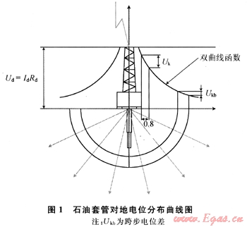 井架和石油套管遠(yuǎn)遠(yuǎn)超出常規(guī)的接地體尺寸,因此一般認(rèn)為石油鉆機(jī)井架就是最好的巨型避雷針,石油套管就是最好的巨型接地體。當(dāng)鉆臺上工頻下某相絕緣破壞或設(shè)備外殼帶電時,觸摸帶電設(shè)備外殼時的接觸電位為Ud,身體站立處的電位為U1: