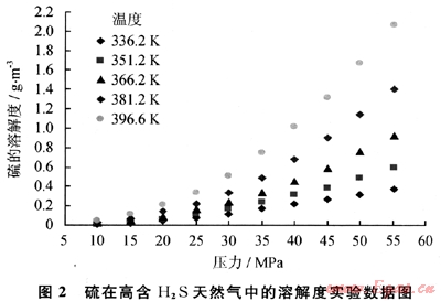不同溫度和壓力下測得的硫在高含H2S天然氣中的溶解度如圖2所示。