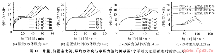 從圖10可以得出排量和平均砂濃度沒有前置液比例對(duì)縫內(nèi)凈壓力上漲的控制力度大,且25m垂直厚度的厚儲(chǔ)層凈壓力漲幅遠(yuǎn)低于14m的薄儲(chǔ)層凈壓力的漲幅。按照凈壓力預(yù)測(cè)結(jié)果,以增加主裂縫縫長(zhǎng)和控制次生裂縫產(chǎn)生為出發(fā)點(diǎn),蘇5、桃7區(qū)塊水平井分段壓裂參數(shù)優(yōu)化范圍如下:排量3.5~4.0m3/min、薄砂體前置液比例45%~50%,厚砂體前置液比例43%~45%,平均砂濃度360~400kg/m3。