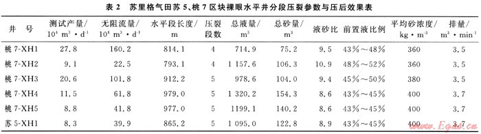 目前,蘇里格氣田蘇5、桃7區(qū)水平井分段壓裂共施工7口井,施工成功率100%,獲得平均測(cè)試產(chǎn)量14.8×104m3/d,平均無阻流量75.6×104m3/d,最高測(cè)試產(chǎn)量27.8×104m3/d,最高無阻力量160.2×104m3/d,具體設(shè)計(jì)及施工參數(shù)和壓后產(chǎn)量如表2所示。壓后效果證明筆者所建立的方法有效,結(jié)論正確,應(yīng)用效果良好。