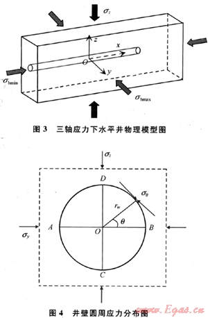 無限大地層水平鉆進(jìn)后在井壁周圍會(huì)產(chǎn)生應(yīng)力集中[2~3],其物理模型如圖3所示,并假設(shè)井筒方向與水平最小主應(yīng)力方向平行。