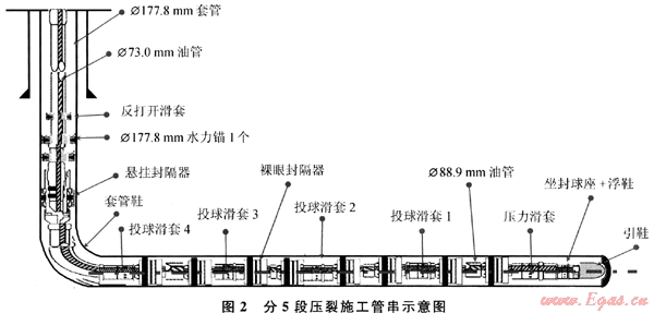 為了讓裂縫在壓裂段能集中起裂,蘇里格氣田多數(shù)以雙封隔器進(jìn)行單段壓裂,例如分5段使用8個(gè)裸眼封隔器,其壓裂施工管柱結(jié)構(gòu)如圖2所示,反打開滑套可在壓裂施工前打開,施工時(shí)以便監(jiān)測(cè)井底壓力。