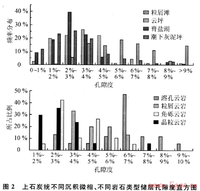 沉積微相是有利儲層發(fā)育的基礎。從沉積作用的角度來看,川東石炭系主要發(fā)育潮坪沉積體系,主要的沉積微相是粒屑灘、云坪、潮下灰泥坪、與膏鹽湖等沉積微相[14~15]。根據(jù)對這些沉積微相的儲層孔隙度等的統(tǒng)計,展示粒屑灘微相的白云巖儲層物性最好(圖2上),孔隙度區(qū)間多介于3%~9%,部分可超過9%,這是因為粒屑灘不僅存在一定的原始沉積孔隙,為埋藏期儲層的白云化、溶蝕作用的發(fā)生創(chuàng)造了有利條件,而且使溶蝕孔隙成為主要的儲集空間。其次是云坪微相,其孔隙度區(qū)間為1%~7%,也有部分超過9%;而潮下灰泥坪與膏鹽湖微相的儲層孔隙度多低于4%,只有少量為4%~9%。因此,粒屑灘沉積微相最有利儲層的形成,并對儲層的后期改善起到重要促進作用。
