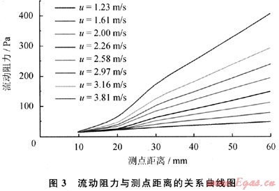 由式(1)可以看出,阻力應(yīng)該與距離成正比。分析造成上述實(shí)驗(yàn)現(xiàn)象的原因是:實(shí)驗(yàn)中放置泡沫陶瓷的鋼管與高壓氮?dú)馄窟B接需要變徑,氣流在異徑處附近的流速分布不是充分發(fā)展紊流,流速分布不對稱,有畸變,還可能有漩渦、回流,在測點(diǎn)處的流速偏小,曲線向速度較低的曲線靠近,形成了圖3中與測點(diǎn)A的距離小于30mm時的流動阻力形態(tài)。因此,在以下分析中,僅對測點(diǎn)距離大于30mm的數(shù)據(jù)進(jìn)行分析,即對測點(diǎn)距離小于30mmm的泡沫陶瓷流動進(jìn)行調(diào)整,以此來消除異徑對測量結(jié)果的影響。
