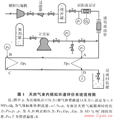 根據(jù)對天然氣管輸減阻劑性質(zhì)及作用機(jī)理的研究,設(shè)計(jì)了天然氣室內(nèi)模擬環(huán)道評價(jià)系統(tǒng),如圖1所示。