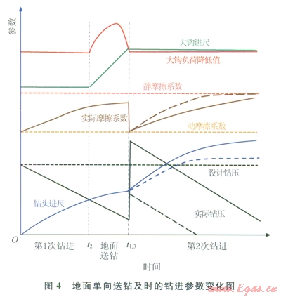 地面單向送鉆是指在鉆進(jìn)過程中沒有上提鉆具操作,只有下放鉆具和停止的送鉆方式。
